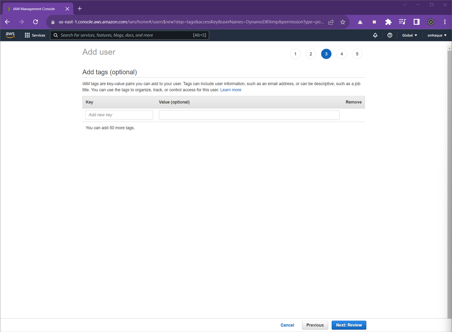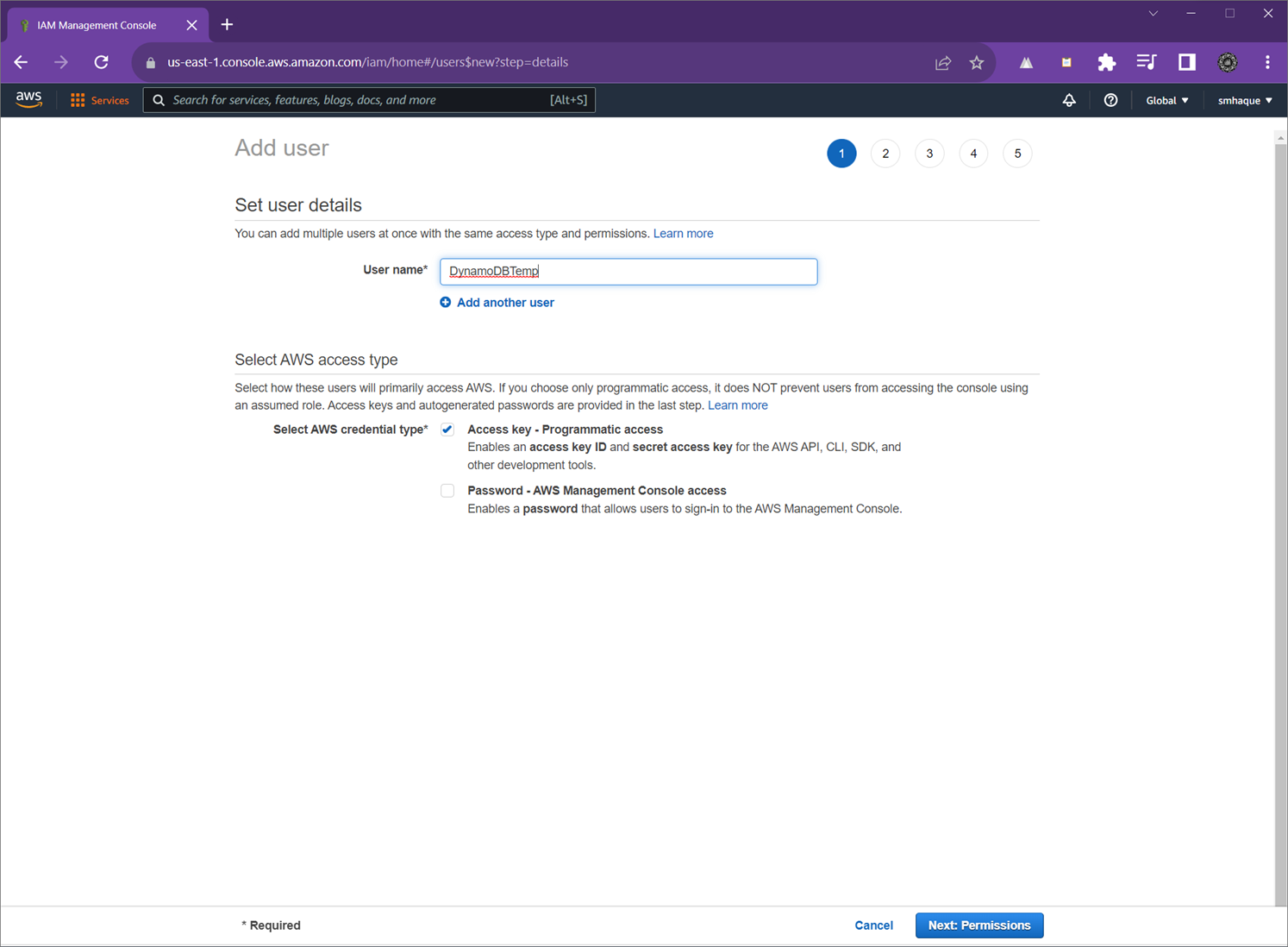 Add a user name and select Programmatic Access, then click Next: Permissions