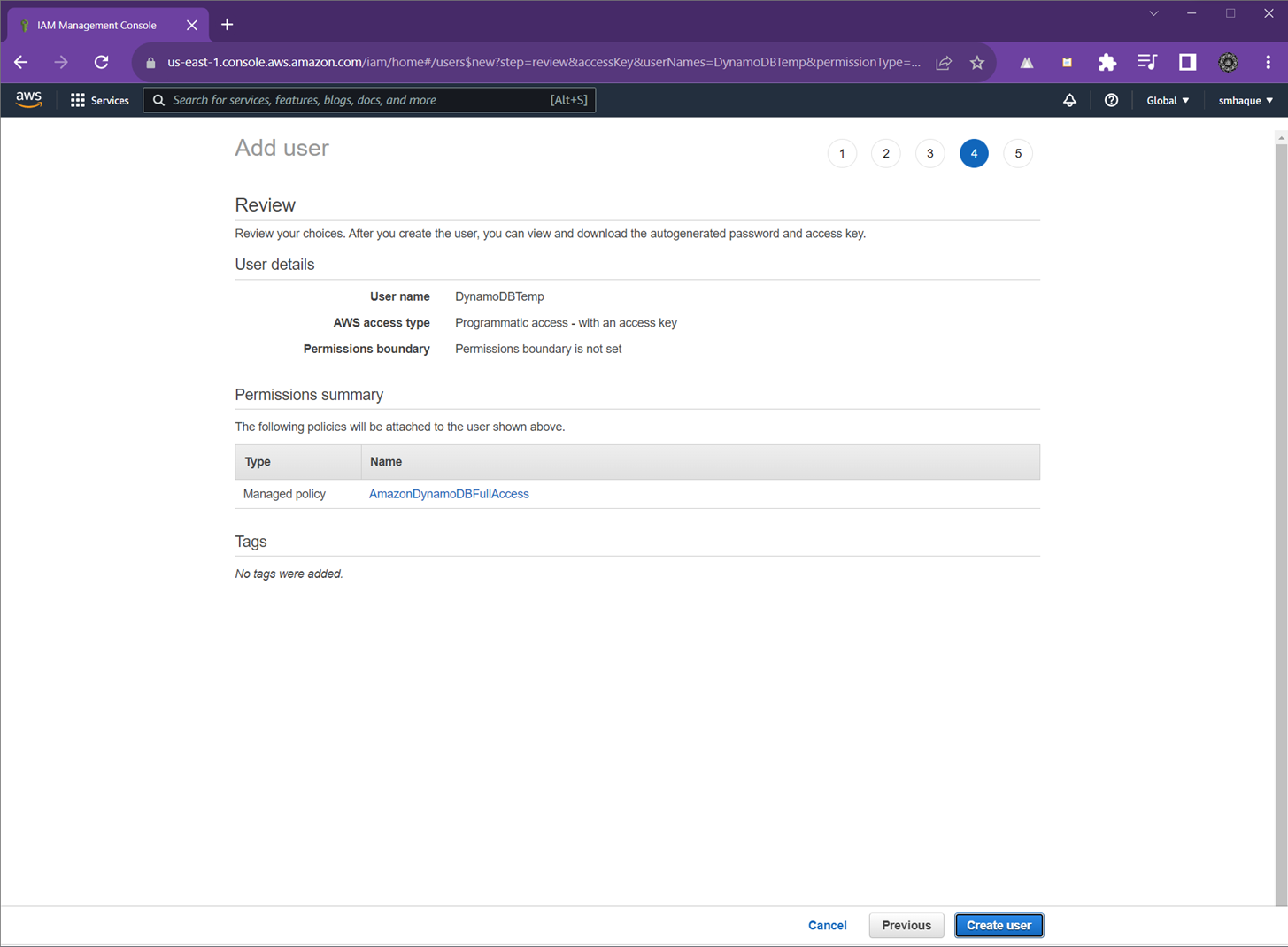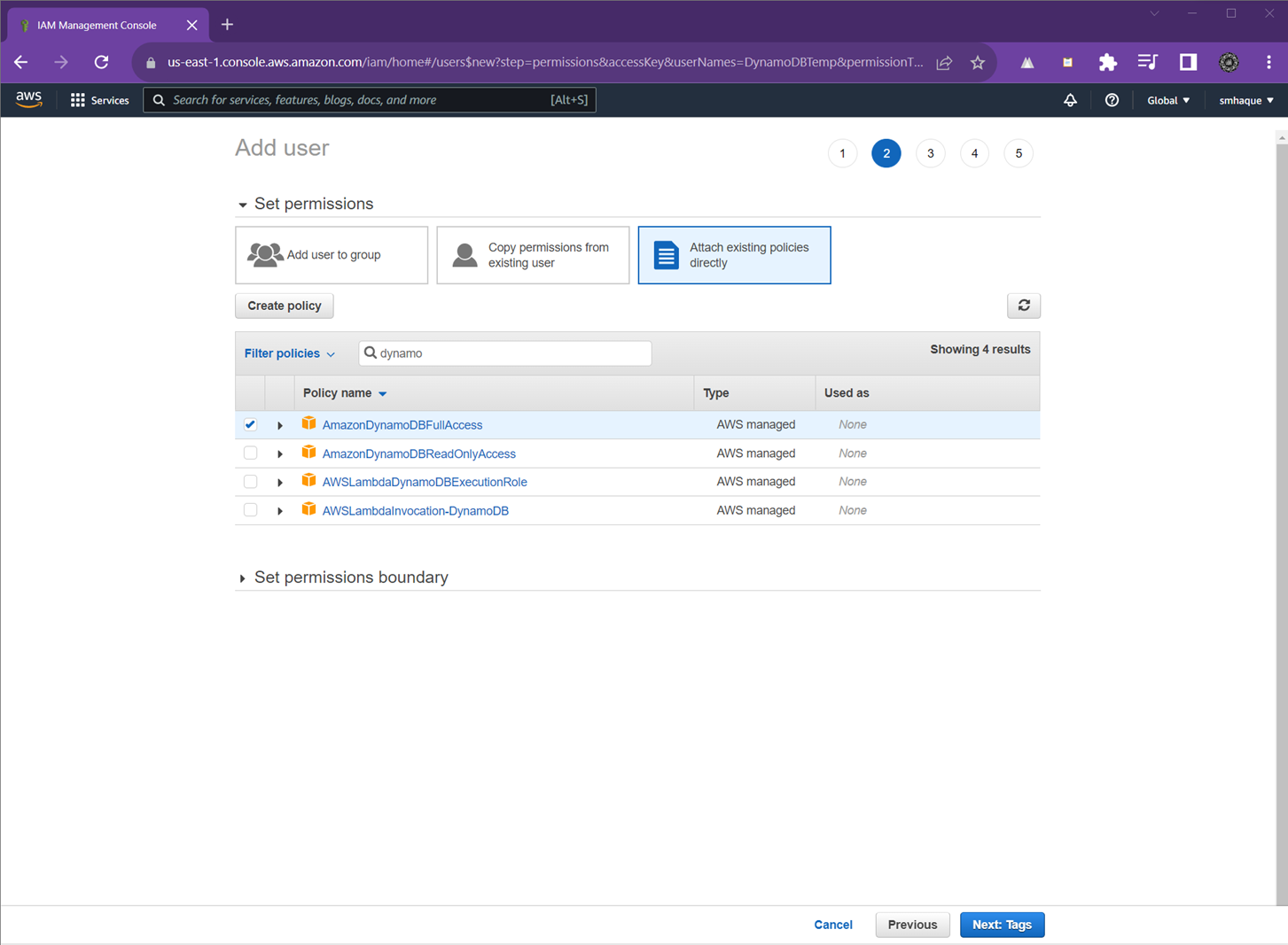 For my AWS CLI setup, I am going to select the option "Attach existing policies directly" and choose to assign Full DynamoDB access.