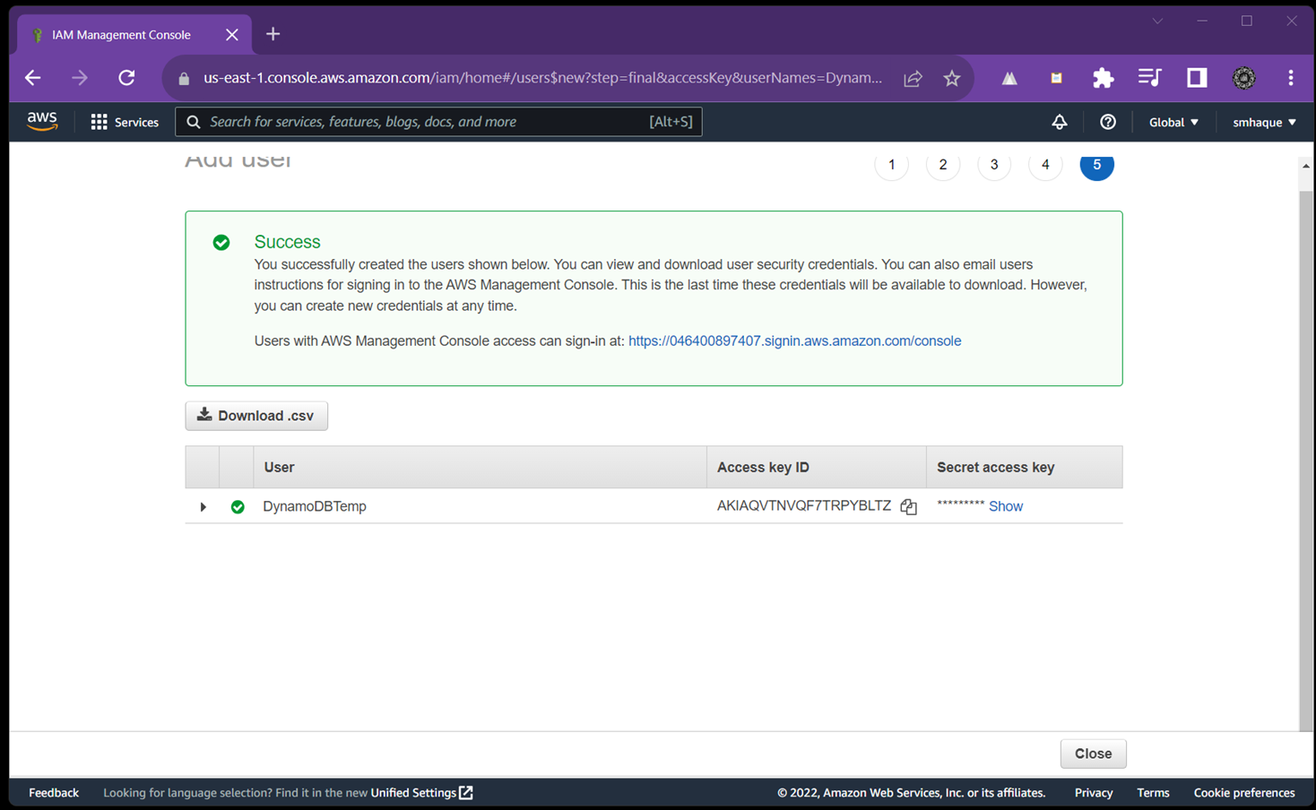 On the next page it will show the User, Access Key, and Secret Access Key.